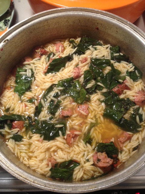 Add the chard and cooled orzo to the simmering broth and cook, stirring, until the chard is wilted and the soup is piping hot, about 1 minute.